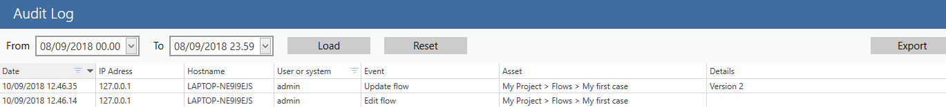 The Audit Log contains information about all events that have occurred on the LEAPWORK Automation Platform. This includes editorial events as well as the running of flows using scheduling, the REST API or by any other method.