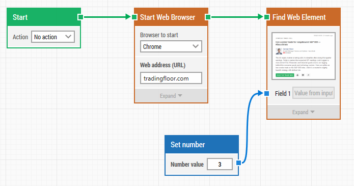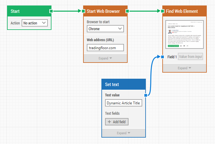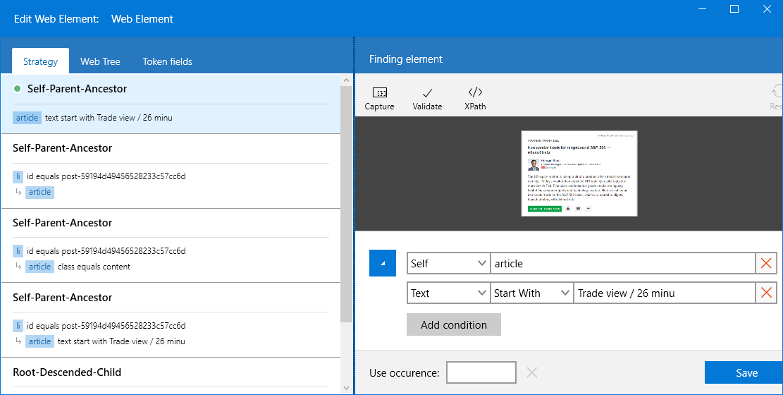One example is, if you use a Find Web Element to select a specific article from a list of articles. One of the default selection strategies produced by LEAPWORK you can choose from, is to select the article by the title as shown below. In the example, the Find Web Element block will search for an "<article>" tag that starts with the text "Trade view / 26 minu".