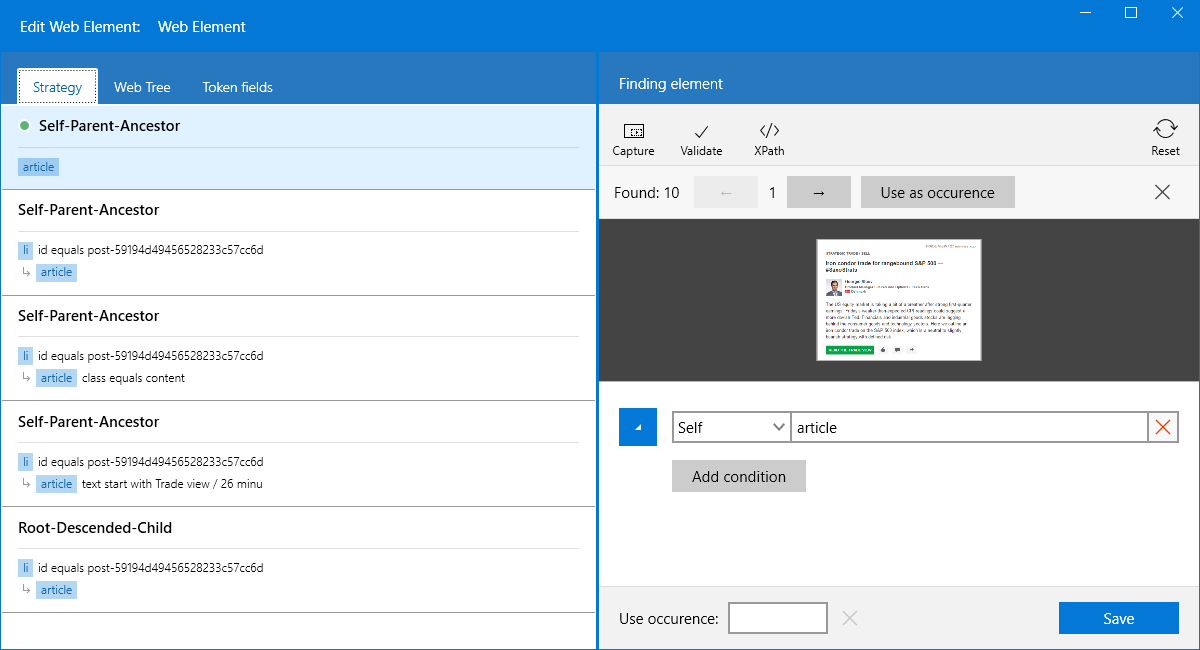 Clicking the "Validate" button will actually perform the search, and in this case it finds 10 matching elements. If you have multiple occurrences you can specify which one you would like to use by setting a value in the "Use occurrence" field below the conditions. If you e.g. specify "4", the fourth article found will be returned.