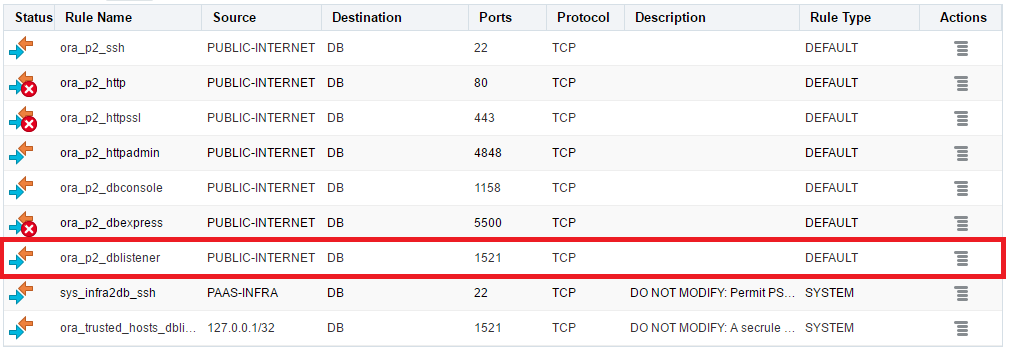 We have a database instance (11g_release2) running on oraclecloud.com. We have opened for database access on port 1521 in the list of access rules: