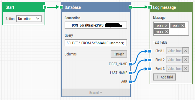 If you experience problems during the execution of the query and when you click refresh to retrieve the columns, you can find more information about the error in the studio.log file (c:\program files\LEAPWORK\Logs\studio.log). It can also be a good idea to verify the query outside LEAPWORK - either via a DBA team or in a local query tool - if you are having problems with the database block.