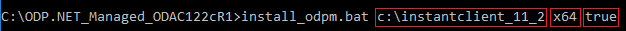 To install ODP.Net run the install_odpm.bat file from a command-prompt running as Administrator. Specify the following parameters:
